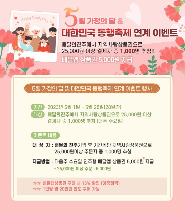 또한, 가정의 달을 맞이하여 5월 1일부터 진주사랑상품권(모바일) 90억 원과 진주형 배달앱 전용 상품권 10억 원 발행한다. 진주사랑상품권은 10% 할인, 배달앱 전용상품권은 15% 할인된 가격으로 개인당 월 20만 원 한도로 구매 가능하다.