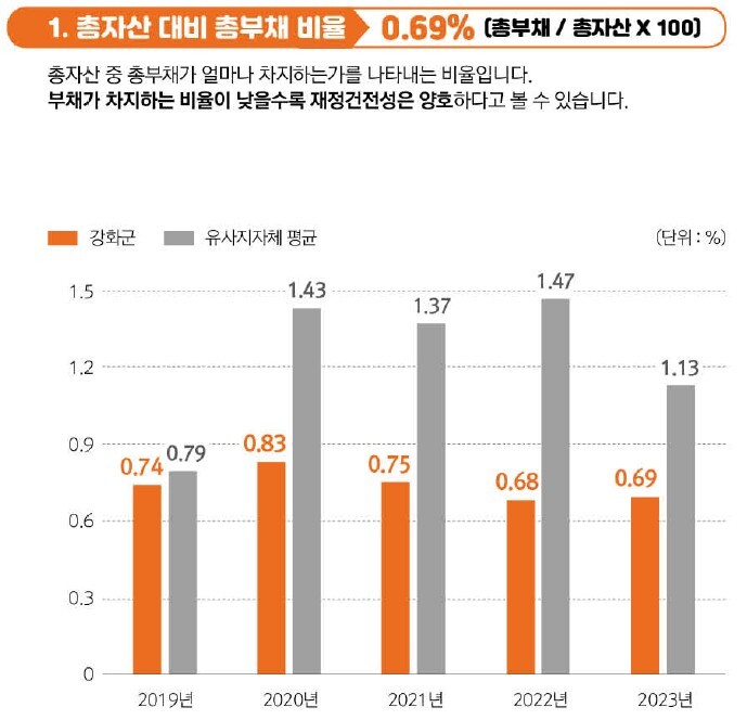 재정건전성의 주요 지표인 부채 비율 항목에 있어 강화군은 0.69%, 유사 지자체 평균은 1.13%로, 이는 유사 지자체 대비 61%로 재무건전성의 대표 지표인 부채비율이 매우 낮다는 것을 의미하며, 채무 또한 없다.