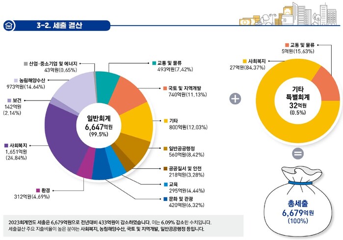 지출 내역의 구성을 세부적으로 살펴보면, 가장 많이 지출한 분야는 사회복지분야로 1651억원이 지출되어 일반회계 총 지출액의 1/4 정도인 24.84%를 차지한다, 이는 점차 고령화 되어가는 우리군의 복지예산 수요를 반영한 군민 맞춤 세출 정책이 이루어졌음을 알 수 있다.