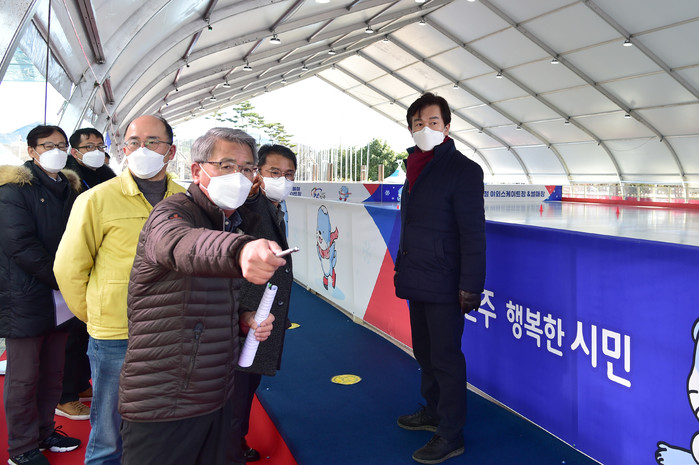 [진주=최성일 기자] 조규일 경남 진주시장은 지난 18일 진주시가 올해 새롭게 조성한 야외스케이트장의 코로나19 방역 조치사항을 점검하기 위해 현장을 방문했다.