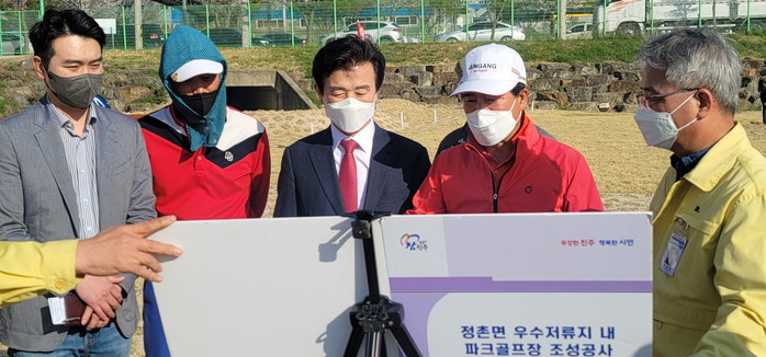 [진주=최성일 기자] 진주시는 지난 7일 정촌면 우수 저류지 내 파크 골프장 조성 공사가 완료돼 현장을 점검했다.