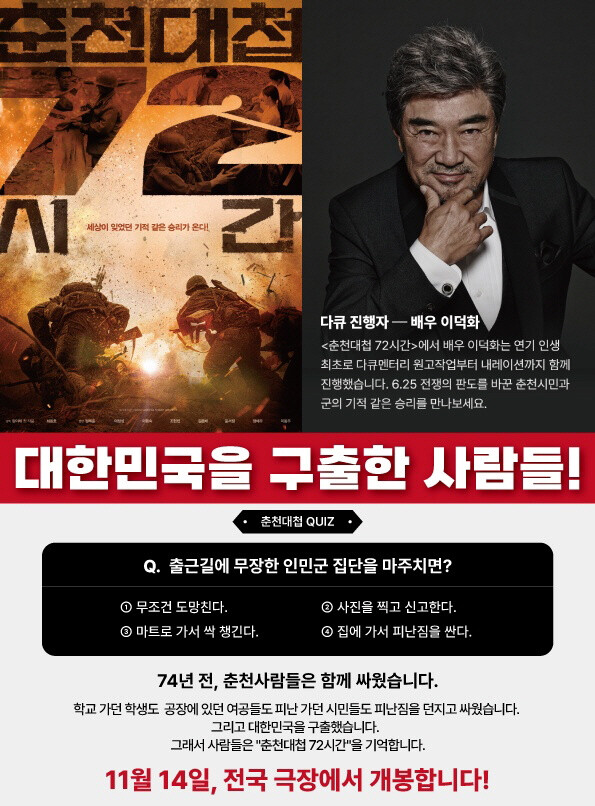 영화 홍보 이벤트로 마련된 이번 퍼포먼스에서는 ‘서울에서 무장 인민군들을 마주쳤다면?’이라는 설문을 던지며, ‘6.25 전쟁 때 춘천 시민들이 목숨을 걸고 나라를 지켰다’라는 메시지를 시민들에게 전달했다.