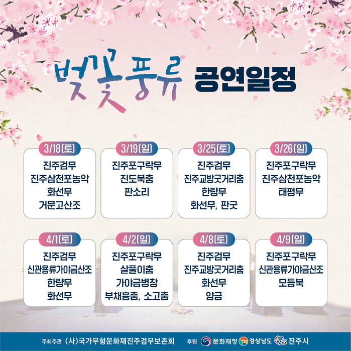 ‘벚꽃풍류’는 문화재청이 공모한 2023년도 무형문화재 전수교육관 활성화 사업으로, 진주검무를 포함한 6개의 우리지역 국가·도 무형문화재와 거문고 산조, 진도북춤, 판소리, 화선무, 양금, 태평무, 판굿, 살풀이춤 부채흥춤, 소고춤 등 다양한 전통문화예술의 공연이 펼쳐진다.