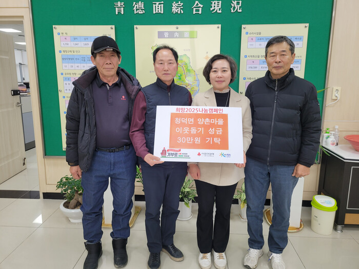 이은숙 청덕면장은 “이웃돕기 성금을 기탁해주신 양촌마을 주민분들께 깊은 감사의 말씀을 드리며 이번 기탁금은 실질적으로 어려운 이웃들에게 전달하겠다.”고 말했다. 기탁받은 성금은 청덕면 관내 어려운 이웃들에게 지원될 예정이다.