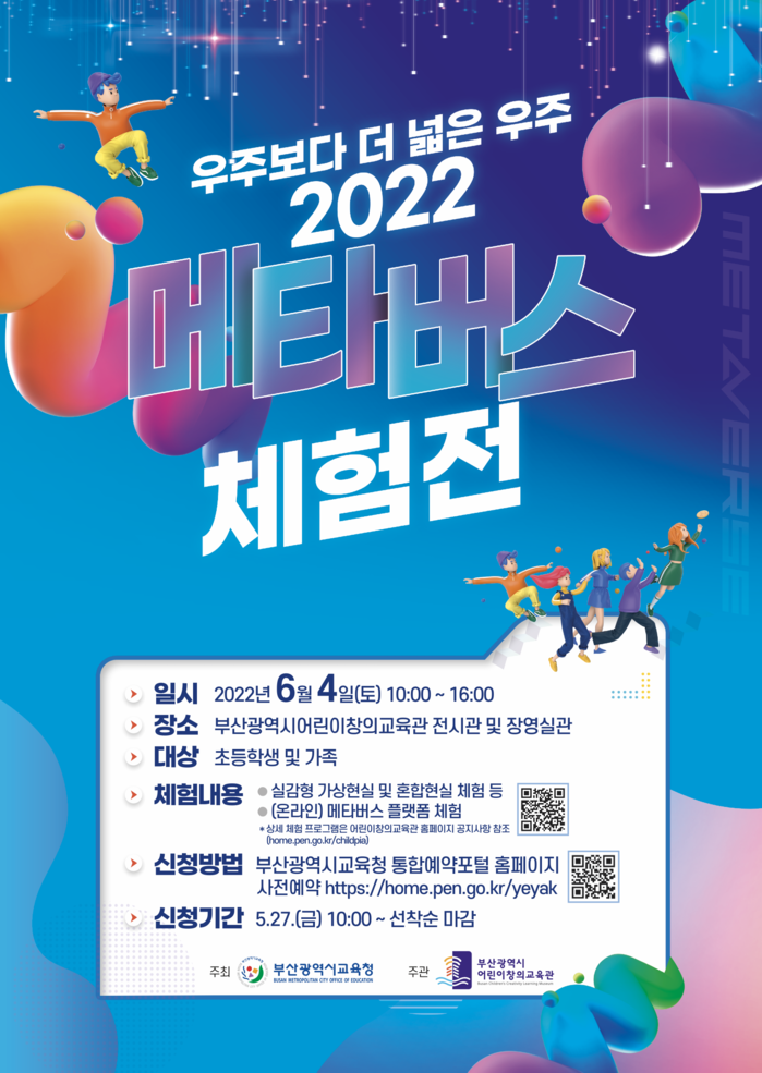 부산광역시어린이창의교육관(관장 류옥자)은 6월 4일 오전 10시부터 오후 4시까지 어린이창의교육관 내 전시관과 장영실관 등에서 초등학생 가족들을 대상으로‘우주보다 더 넓은 우주’를 주제로 ‘2022 메타버스 체험전’을 연다.