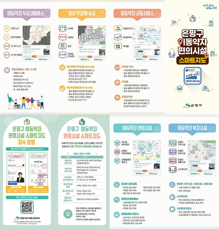 지도에는 경사로가 설치된 상점, 장애인 거주시설, 장애인 친화미용실, 전동휠체어 충전소 등 총 14종의 다양한 편의시설 정보가 담겨있다. 또한 무료 셔틀버스, 아이맘택시, 은평모두로, 백세콜 등 다양한 교통서비스 안내를 함께 제공해 이동 약자의 편의를 높였다.