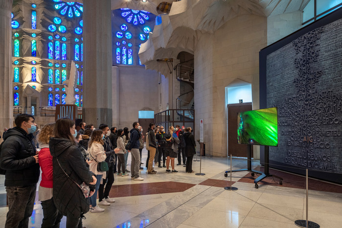 | ▲ 스페인 바르셀로나에 위치한 사그라다 파밀리아 대성당(가우디 성당)에서 관람객들이 삼성 Neo QLED 8K를 통해 성당의 모습을 담은 영상을 감상하고 있다.(사진제공=삼성전자) |