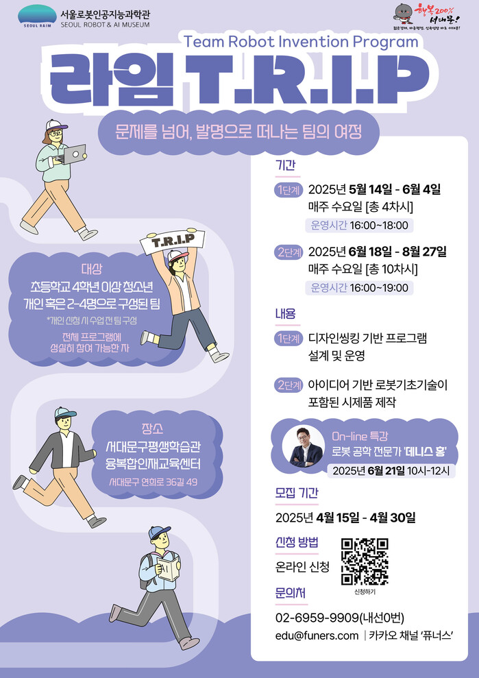 [시민일보 = 이대우 기자] 서대문구(구청장 이성헌)가 서울시립과학관(서울로봇인공지능과학관)과 손잡고 오는 8월까지 서대문구평생학습관·융복합인재교육센터에서 로봇발명 프로그램 ‘라임 T.R.I.P(Team Robot Invention Program)’을 운영한다.