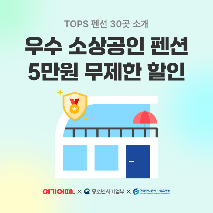 여기어때는 중소벤처기업부, 한국중소벤처유통기업원과 함께 ‘TOPS 펜션’을 예약하면 최대 5만원의 추가 할인 혜택을 제공한다. TOPS는 소상공인의 성장을 지원하고, 우수 상인을 발굴하는 프로젝트다. 여기어때는 이번 프로젝트에서 숙박 부문을 맡아 30개 업체를 선별하고, 숙소 할인 쿠폰 등 맞춤형 마케팅을 지원한다.