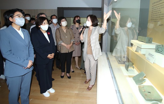 | ▲ 유미자 강진부군수가, 김보미 강진군의회 의장, 강진교육지원청 최광희 교육장, 이수미 국립광주박물관장, 청자 도예작가, 국립해양문화재연구소, 고흥분청문화박물관 관계자 등이. 지난 24일부터 올해 11월 27일까지 ‘書齋三詠(서재삼영), 향로‧화분‧베개’라는 주제로 열리고 있는 강진군 고려청자박물관 특별전시장을 찾아 문화관광해설사로부터 작품에 대한 설명을 경청하며 관람하고 있다. / 강진군 제공 |
