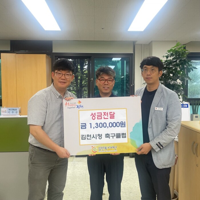 [김천=박병상 기자] 경북 김천복지재단(이사장 김충섭)은 지난 30일 김천시청 축구클럽(단장 박근덕)으로부터 130만원을 기탁받았다고 밝혔다.