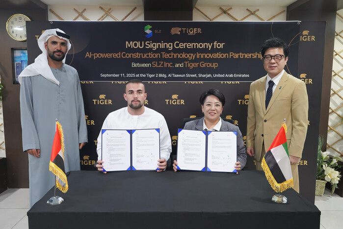 | ▲ 시흥산업진흥원은 시흥창업센터 입주기업인 주식회사 에스엘즈가 9월 11일, 아랍에미리트의 대표적인 초고층 주거시설 건설 전문 기업인 타이거 그룹(Tiger Group)과 AI 기반 스마트 건설 기술 협력을 위한 업무협약(MOU)을 체결했다 /사진제공=시흥산업진흥원 |