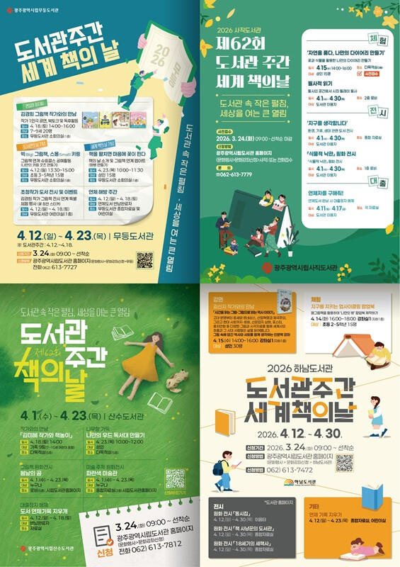 강연·체험 프로그램 참가 신청은 3월 24일부터 시립도서관 누리집 ‘문화강좌 신청’ 메뉴에서 하면 된다. 자세한 사항은 누리집을 참고하거나 무등, 사직, 산수, 하남도서관으로 문의하면 된다.