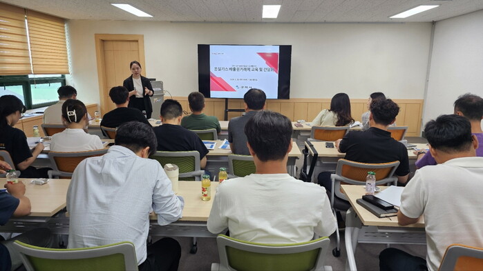 이번 교육은 정부 온실가스 감축 정책 동향, 온실가스 배출권거래제 최근 이슈와 개정 지침, 구미시 2023년 배출권거래제 이행 결과, 시설별 감축 방안 등이 진행됐다.