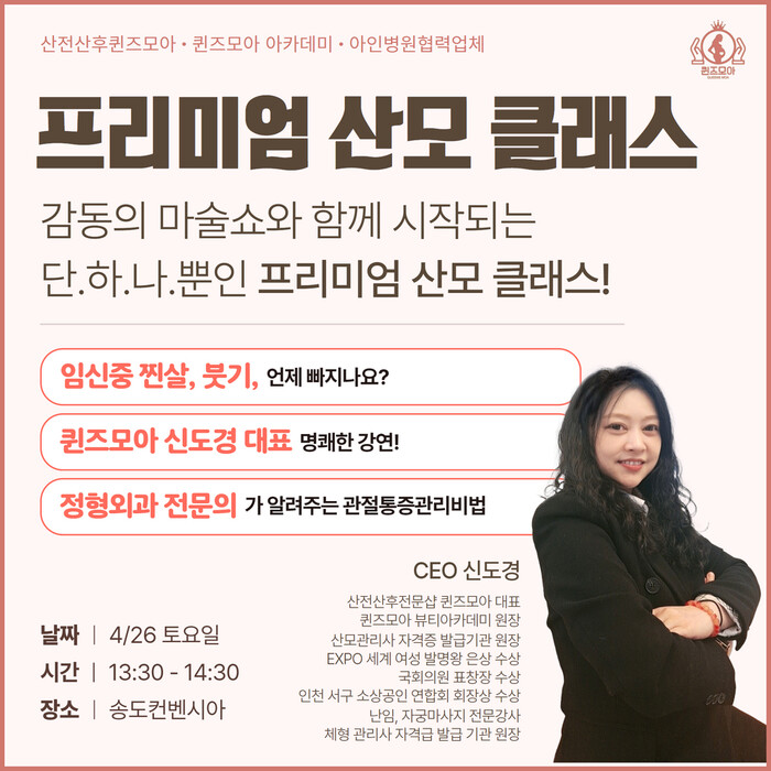 산모 전문 관리 샵 퀸즈모아는 산모들을 전문적으로 케어하며 이번 베이비페어를 통해서 프리미엄 산모 클래스를 진행할 예정이다. 프리미엄 산모 클래스는 베이비페어 기간 중 4월 26일 토요일 진행 예정이며 13:30분부터 14:30까지 진행된다.