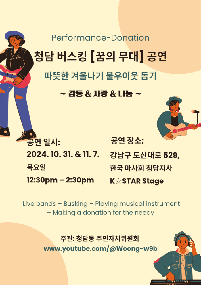 청담동 주민자치위원회가 주관하는 ‘2024 청담 버스킹 꿈의 무대’는 지난 4월부터 아마추어 거리예술가에게는 자신의 공연을 선보일 무대를, 인근 주민과 직장인, 관광객에게는 문화예술을 접할 수 있는 기회를 제공하고 있다.