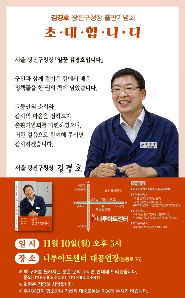 [시민일보 = 여영준 기자] 김경호 서울 광진구청장이 오는 10일 오후 5시 광진구 나루아트센터 대공연장에서 '일꾼 김경호입니다' 출판 기념회를 연다.