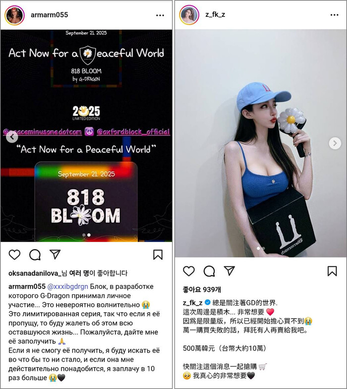 러시아의 한 인플루언서는 자신의 인스타그램에 “GD가 직접 참여한 블록…정말 믿을 수 없을 만큼 설레요. 혹시 못 구하더라도, 반드시 찾아낼 거예요. 필요하다면 10배의 금액이라도 지불할테니 연락달라”고 언급했고, 60만명의 팔로워를 보유한 대만의 인플루언서 진우비는 SNS에 “늘 바라보기만 했던 지디의 세계. 이번엔 블럭… 한정판이라 못 살까봐 벌써 걱정이네. 혹시라도 구매 실패하면 누군가 제발 나한테 다시 팔아줘요”라며 게시글을 올렸다.