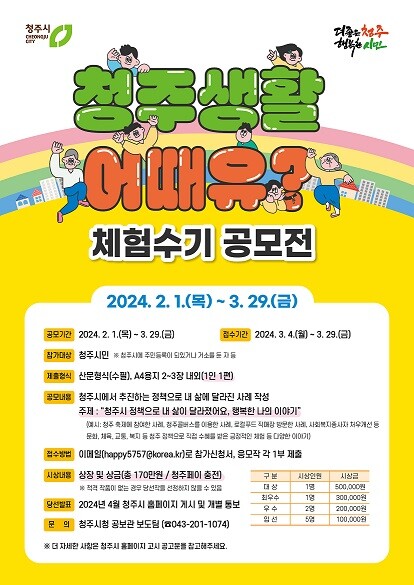 해당 공모전은 청주시 정책의 실제 수혜 사례를 수요자인 시민 관점에서 체험수기를 공모함으로써, 청주시 정책을 널리 알리고 시정의 운영 방향에 도움을 얻고자 추진하는 것이다.