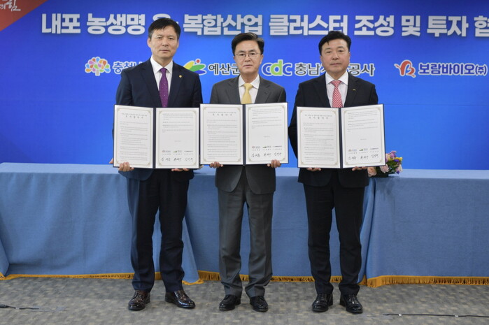 [예산=김의석 기자] 충남 예산군이 최근 도청 상황실에서 ‘내포 농생명 융·복합 클러스터 조성’을 위한 업무 및 투자협약을 체결했다.