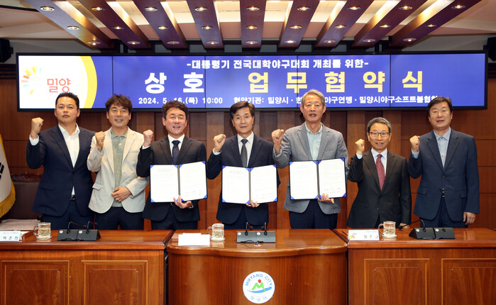 [밀양=최성일 기자] 경남 밀양시는 지난 16일 시청 소회의실에서 한국대학야구연맹, 밀양시야구소프트볼협회와 대통령기 전국대학야구대회 개최를 위한 업무협약을 체결했다고 밝혔다.