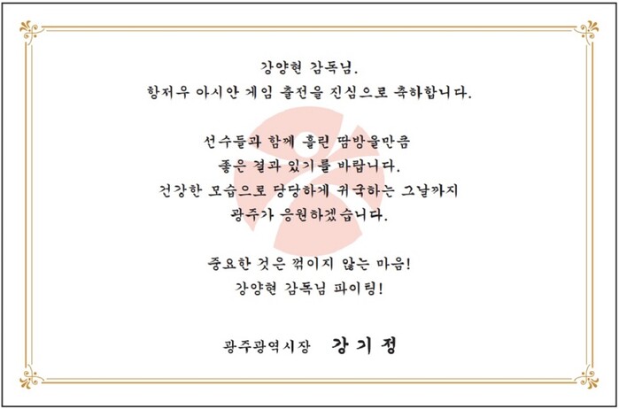 | ▲ 강기정 광주광역시장, 2023년 중국 항저우 아시안게임 출전한 광주광역시 소속 국가대표 강양현 감독 격려카드 이미지 / 광주광역시 제공 |