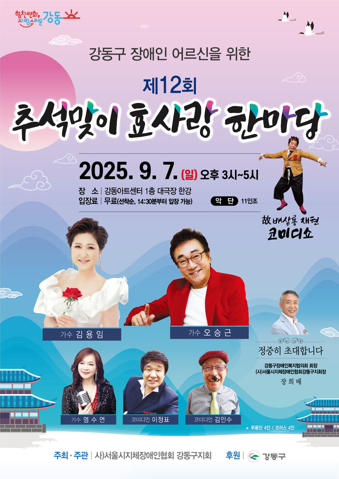 행사는 (사)서울시지체장애인협회 강동지회(회장 장희배) 주최, 강동구 후원으로 열리며, 관내 장애 어르신과 가족, 장애인 복지 종사자 등 지역 주민들의 일상을 위로하고 따뜻한 명절을 선물하고자 다채로운 프로그램으로 마련했다.