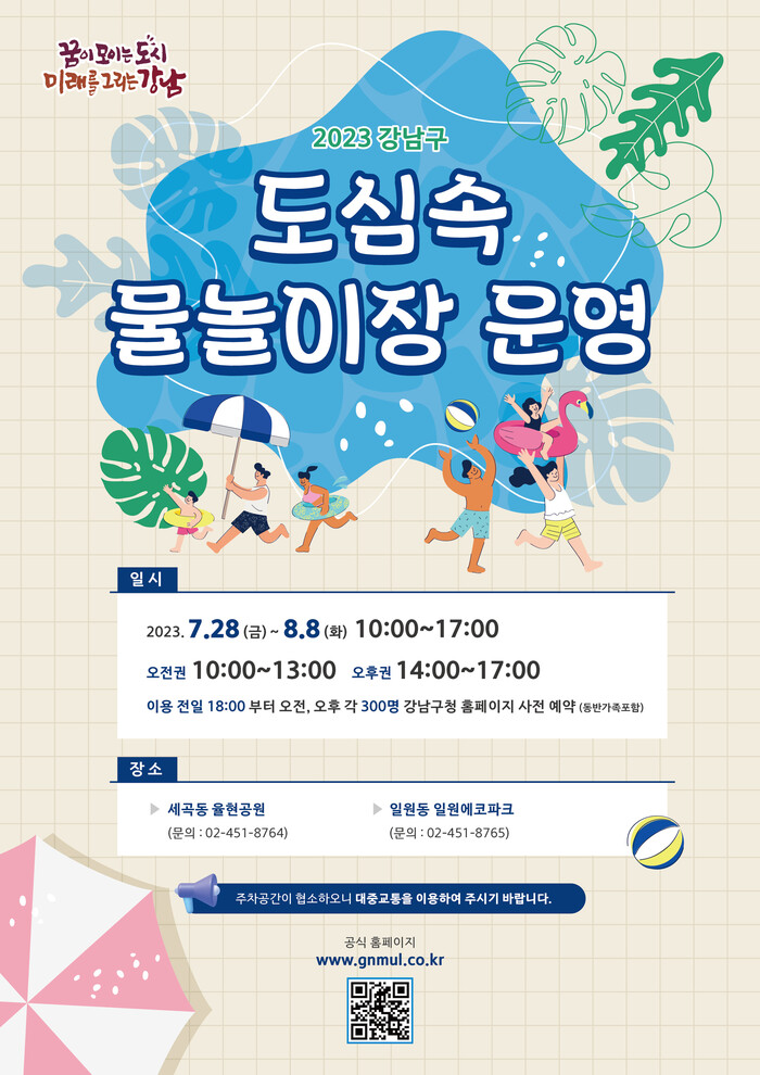 조성명 강남구청장은 “4년 만에 개최되는 도심속 물놀이장에서 무더위를 식힐 수 있길 바란다”며 “물놀이장의 안전과 위생 관리를 철저히 해 어린이들이 안전하고 즐겁게 물놀이장을 이용할 수 있도록 하겠다”고 말했다.