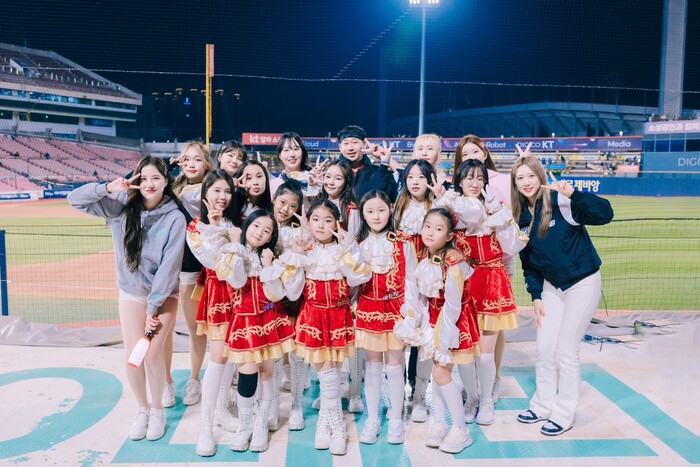 | ▲ 프로야구 경기를 마치고 수원KT WIZ 응원단과 기념사진을 촬영(인은주, 앞줄 좌측)하고 있다. |