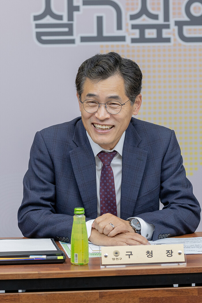 ▲ 지난 22일 간부회의에서 직원들과 소통중인 이기재 양천구청장.(사진=양천구청 제공) |