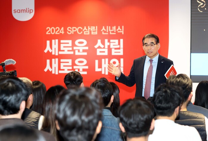 | ▲ 지난 2일 서초구 양재동 SPC1945에서 SPC삼립 황종현 대표이사가 새로운 기업 슬로건과 2024년 경영전략을 설명하고 있다. |