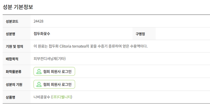 최근 화장품법 개정에 따라 ‘나비콩꽃’이라는 명칭이 ‘접두화꽃’으로 변경되었으며, 이에 따라 전성분 표기에는 “접두화꽃수”로 표기해야 한다.
