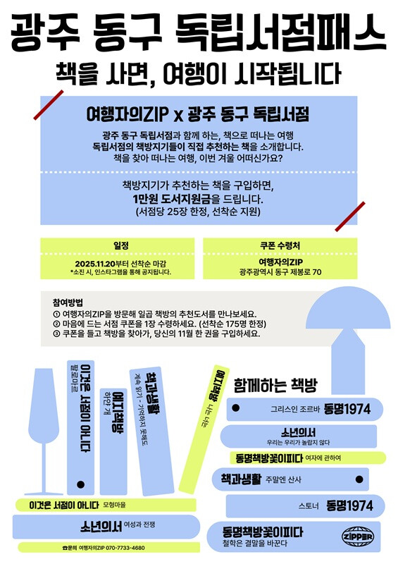 프로그램 참여 방법은 여행자의 집(ZIP)에서 원하는 책방 쿠폰을 수령한 뒤, 해당 서점에서 책을 구매하면 1만 원 도서 지원금 혜택을 받는 방식이다. 서점별로 25명, 총 150명의 참여자를 대상으로 진행된다. 각 서점에서는 책방지기가 직접 선정한 ‘연말 추천도서’ 12권을 만나볼 수 있어, 단순한 구매를 넘어 책과 깊이 있게 만나는 기회를 제공한다.
