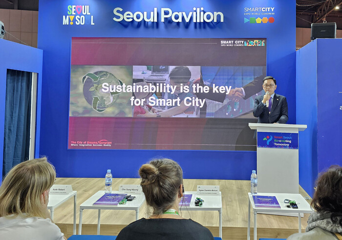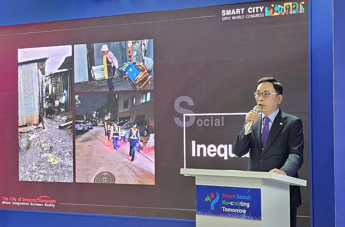 조성명 강남구청장이 최근 스페인 바르셀로나에서 열린 2023 스마트 시티 엑스포 월드 콩그레스(Smart City Expo World Congress, SCEWC)의 서울 포럼에 참가해 ‘지속 가능성과 스마트 도시’를 주제로 기조연설을 했다.