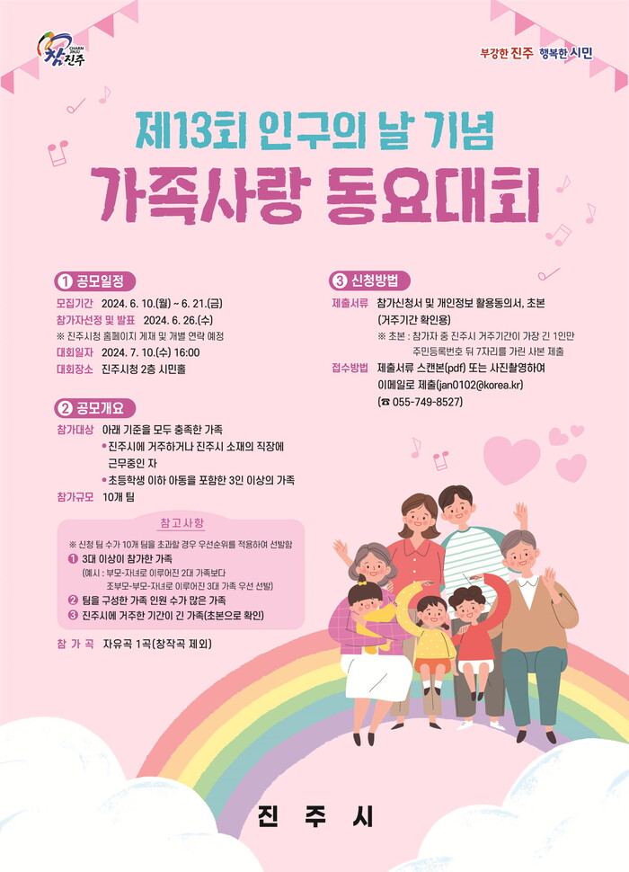 진주시는 7월 10일 오후 4시 시청 2층 시민홀에서 ‘제13회 인구의 날 기념행사’에 『가족사랑 동요대회』를 개최한다.