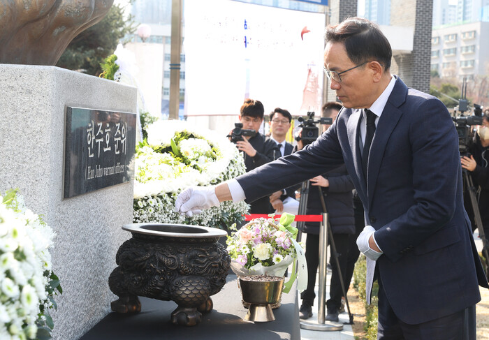 | ▲ '제14주기 故 한주호 준위 추모식'에서 분향을 하고 있는 조성명 구청장 구청장.(사진= 강남구청 제공) |