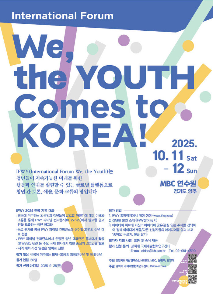 이번 ‘2025 한국 지역대화’는 ‘변화를 위한 연결(Connect for Change)’을 주제로 열린다. 이는 한국에 거주하는 외국인과 청년들이 글로벌 의제에 대한 이해와 소통을 통해 10월 27일부터 29일까지 있는 ‘이프위(IFWY) 파이널 컨퍼런스’에서 발표할 권고안을 도출하는 자리다.