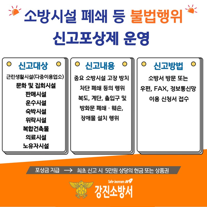 | ▲ 소방시설 불법행위 신고포상제. 운영 홍보 이미지 / 강진소방서 제공 |