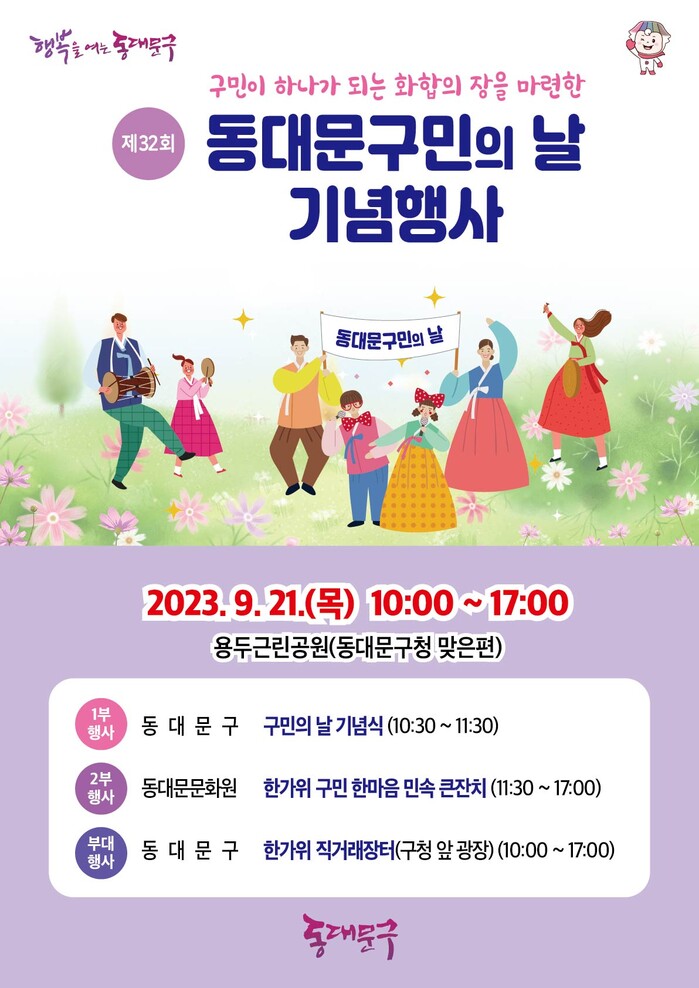 이필형 동대문구청장은 “오는 9월 21일 민족 최대의 명절 추석을 앞두고 지역에 대한 애정과 자긍심을 높일 수 있는 자리를 마련했다”며 “구민들이 모여 함께 즐기며 소통과 화합의 장이 될 이번 행사에 많은 관심과 참여 바란다”고 밝혔다.