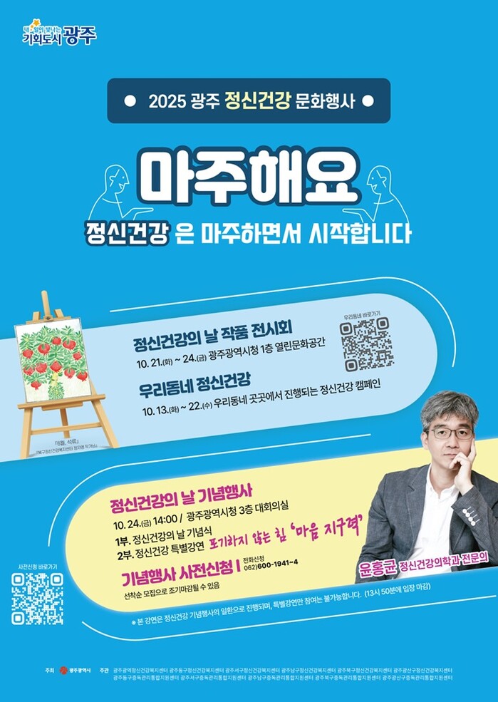 [광주=정찬남 기자] 광주광역시(시장 강기정)는 ‘정신건강 홍보주간’(10월 10~24일)을 맞아 시민의 마음 건강 증진을 위한 다양한 문화행사를 연다.