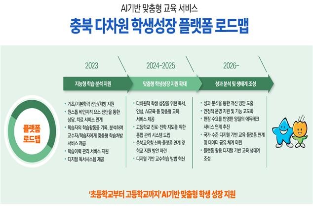 새롭게 구축되는 충북 다차원 학생성장 플랫폼 ‘다채움’을 통해 디지털 기반의 미래형 교수학습 환경 위에서, 인공지능.빅데이터 기술을 활용한 ▲학습수준 진단 및 맞춤형 학습 추천 기능 ▲학습유형 검사 기능 ▲체계적인 학습이력 관리 기능 등을 제공하여 학생의 기초.기본학력 향상과 다차원적 성장을 지원할 계획이다.