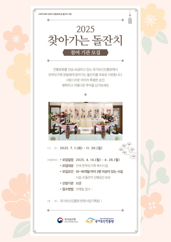 한편, ‘2025년 사회적 배려 대상자 전통혼례 및 돌잔치 지원’ 사업에 대한 자세한 정보는 국가유산진흥원 홈페이지를 통해 확인할 수 있으며, 관련 문의는 국가유산진흥원 한류사업기획팀으로 하면 된다. 따뜻한 마음이 전해지는 이 사업이 더욱 많은 이들에게 희망과 행복을 선사할 수 있기를 기대해 본다.
