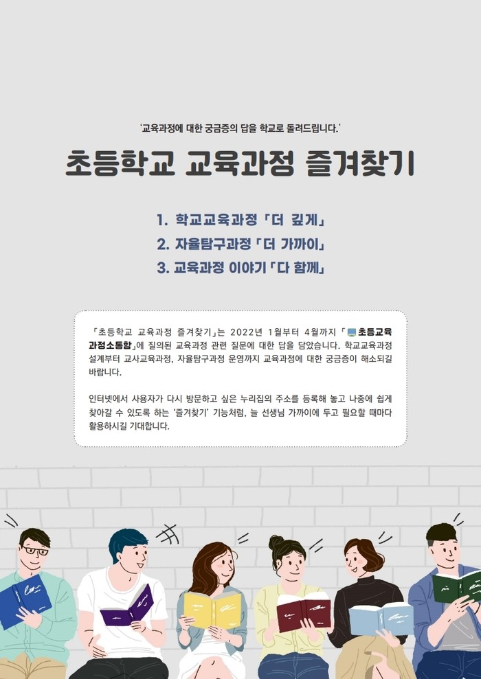 ‘초등학교 교육과정 즐겨찾기’는 ▲학교교육과정 더 깊게 ▲자율탐구과정 더 가까이 ▲교육과정 이야기 다 함께 등 세 부분으로 구성됐다.