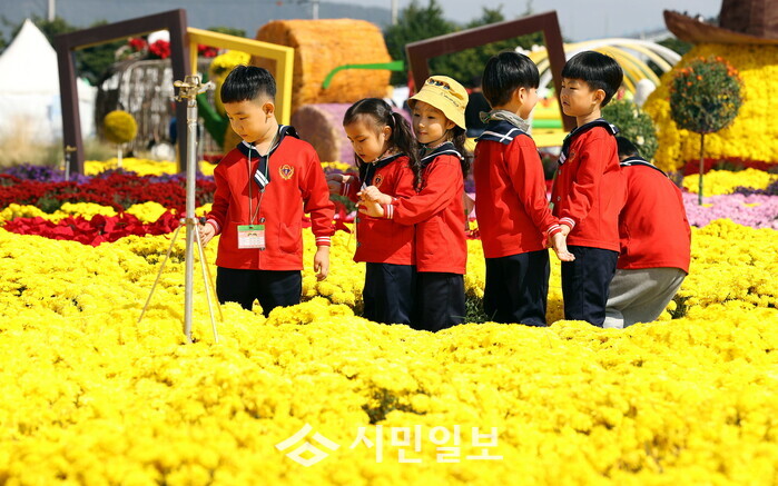 | ▲ 관내 어린이집 아동들이 갈대축제장 국화꽃 단지에서 자연 생태체험을 하고 있다. / 강진군 제공 |