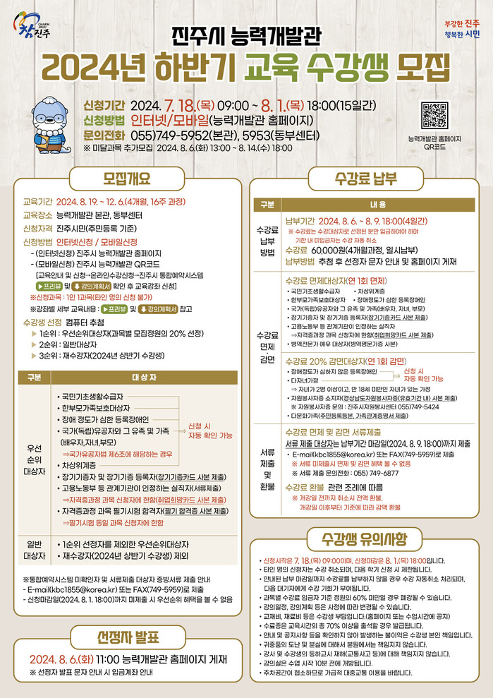 진주시 능력개발관은 7월 18일부터 8월 1일(18시)까지 15일간 ‘2024년 하반기 정기교육’63개 프로그램에 참여할 1095명의 수강생을 모집한다.