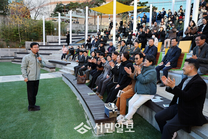 | ▲ 박병규 광산구청장이 지난 21일 수완호수공원에서 지역주민을 대상으로 ‘수완지구 근린공원 함께누리 새단장사업’을 설명하고 있다. / 광주광역시 광산구청 제공 |