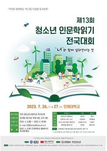 김해시와 책읽는사회문화재단이 주최하고 인제대학교가 주관하는 김해시 청소년 인문학읽기 전국대회는 7월 26일부터 27일까지 양일간 인제대학교에서 열린다.