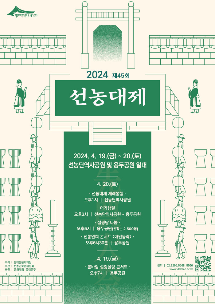 19일(금)에는 선농대제 축하 공연으로 용두공원에서 소리꾼 신승태와 재즈밴드 프렐류드가 출연하는 ‘봄바람 설렁설렁 콘서트’가 열린다.