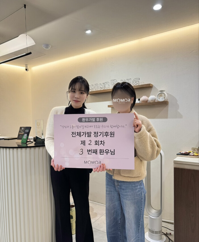 모모란위그 관계자는 "항암 환우분들께 단순한 가발이 아닌 위로와 용기가 되길 바라는 마음으로 기부 활동을 이어가고 있다"며 "앞으로도 환우분들의 자연스러운 아름다움과 자신감 회복을 위해 최선을 다하겠다"고 전했다. 한편 모모란위그는 서울 강남구 논현로175길 17 5층에 위치해 있으며, 예약 후 방문 가능하다.