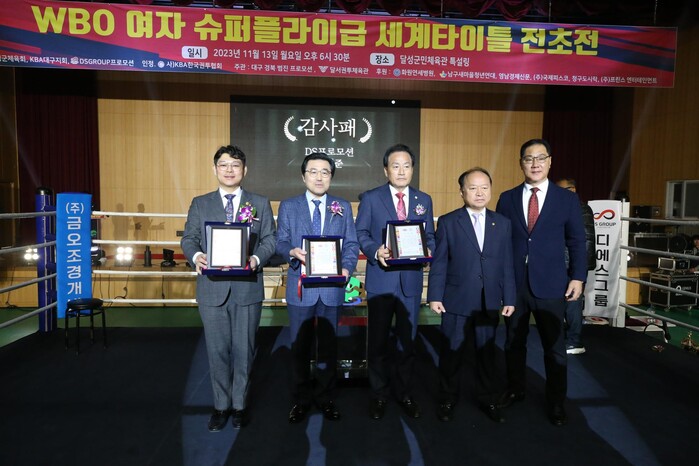 복싱활성화를 공로로 감사패 수여식에는 달성군수 최재훈 군수님 달성군의회 서도원 의장님, 달성군체육회 김성제 회장님 . 대회장 이영선 박사님, DS프로모션 (주)디에스그룹 정희준 대표님 께서 감사패를 받았다.